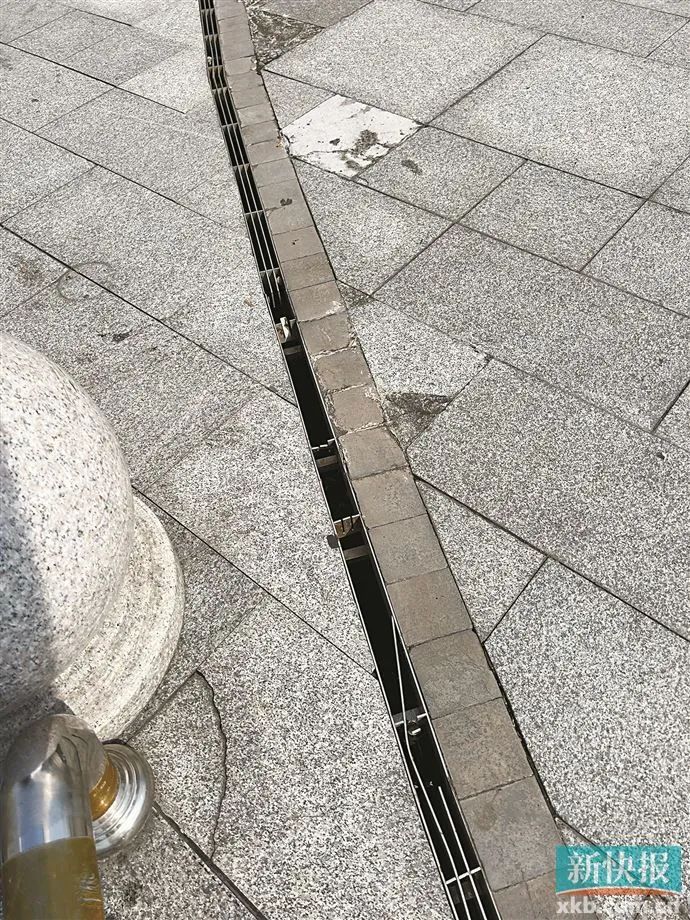 “地面有个下水槽的格栅,孩子沿着格栅走,蹲下玩的时候就刮到腿了,他过来跟我说腿痛,流血了我才发现刮了挺大一个伤口,去医院缝了四针。”李先生说,广场下水槽不少地方都有铁丝,绑扎得比较杂乱,有部分铁丝已经伸出地面翘了起来,高过地板砖。
