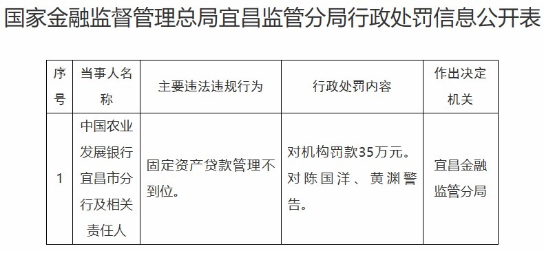 同时,宜昌金融监管分局对相关责任人陈国洋、黄渊警告。